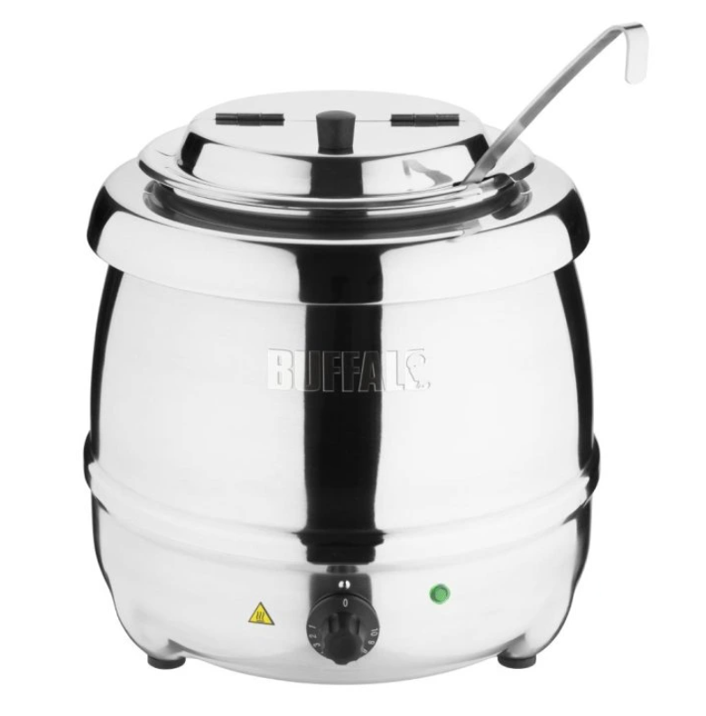 Elektrický varný kotlík o objemu 10 litrů pro udržování a výdej teplých polévek, omáček, guláše a dalších pokrmů. Nepřímý ohřev = vodní lázeň = nedochází k připékání.